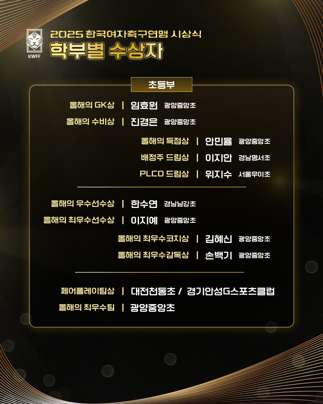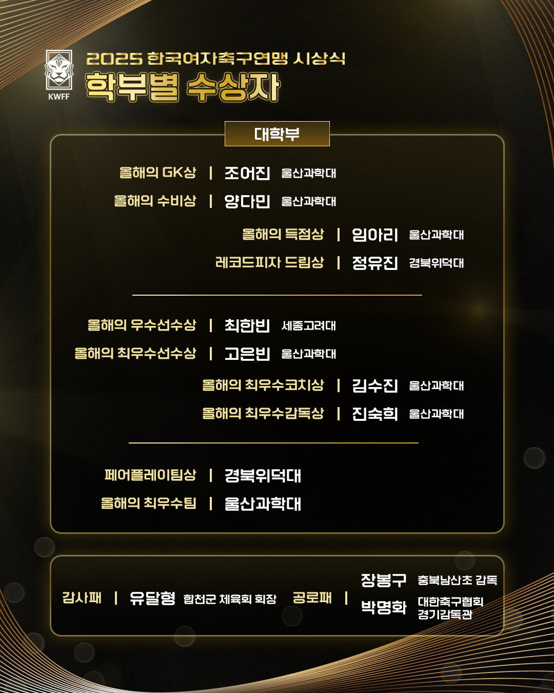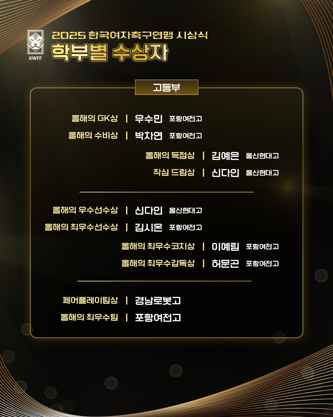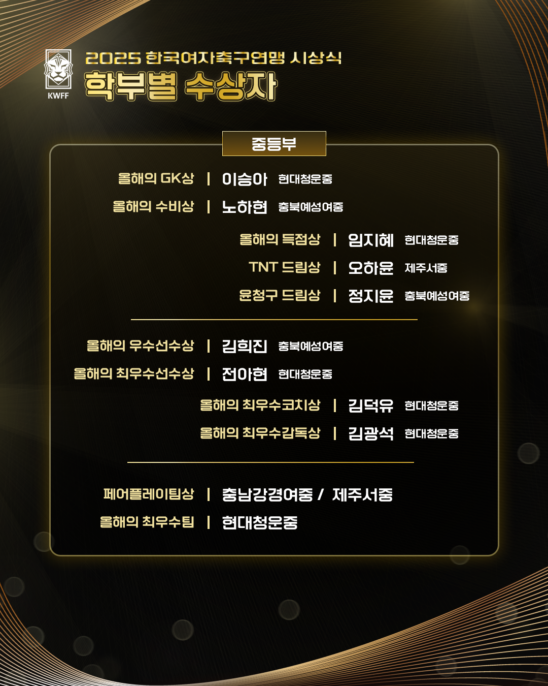 [KWFF] 2025 한국여자축구연맹 시상식 학부 별 수상자 안내(초, 중, 고, 대)