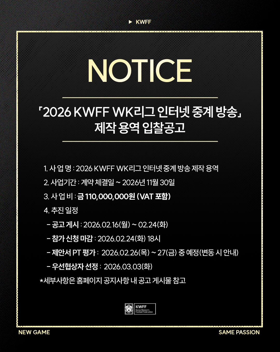 [KWFF] 「2026 KWFF WK리그 인터넷 중계 방송」제작 용역 입찰공고