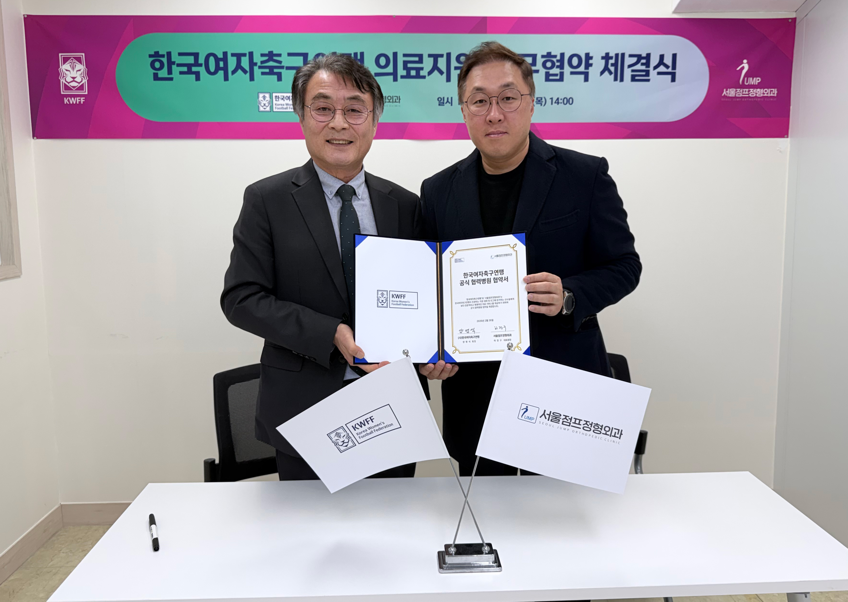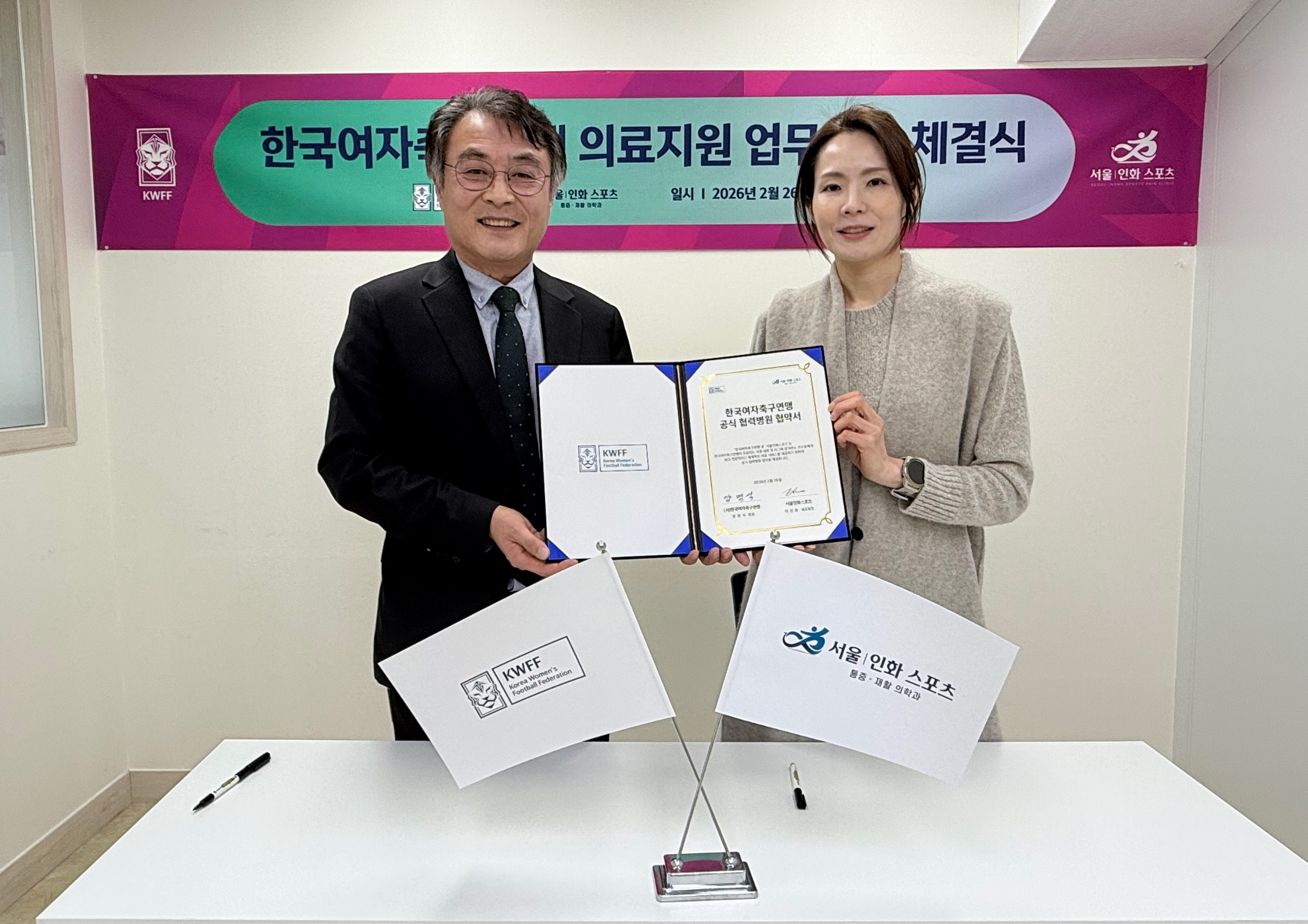 한국여자축구연맹(이하 연맹)이 지난 26일 서울인화스포츠마취통증의학과(이하 인화스포츠), 서울점프정형외과(이하 점프정형외과)와 연맹 기본 의료체계 구축 및 협력병원 지정 업무협약(MOU)을 체결했다.