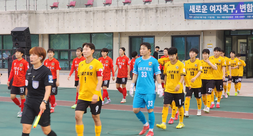 <사진 : 2025 WKL 12R 세종스포츠토토와 상무여자축구단이 경기장으로 입장하고 있다.>